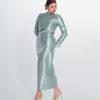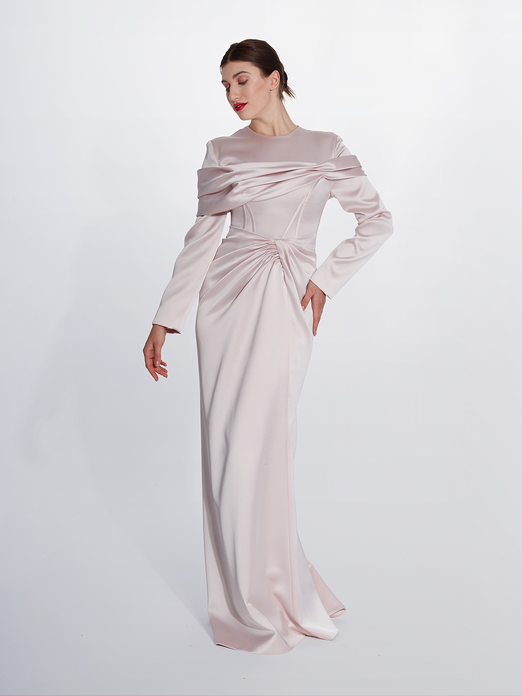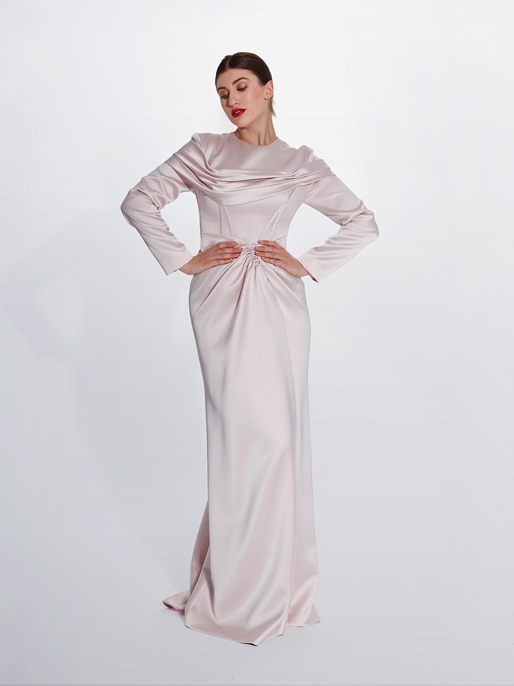 Arkadan kuyruklu, balenli, çapraz drapeli uzun elbise
