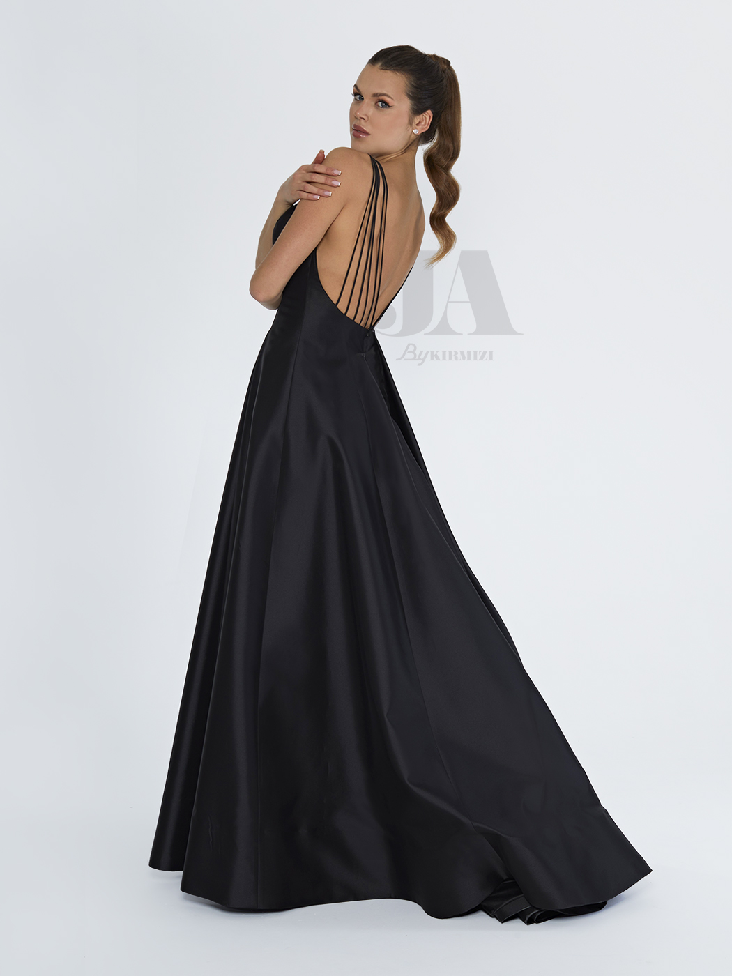 Sırtında sıralı ipleri olan siyah uzun elbise.
