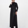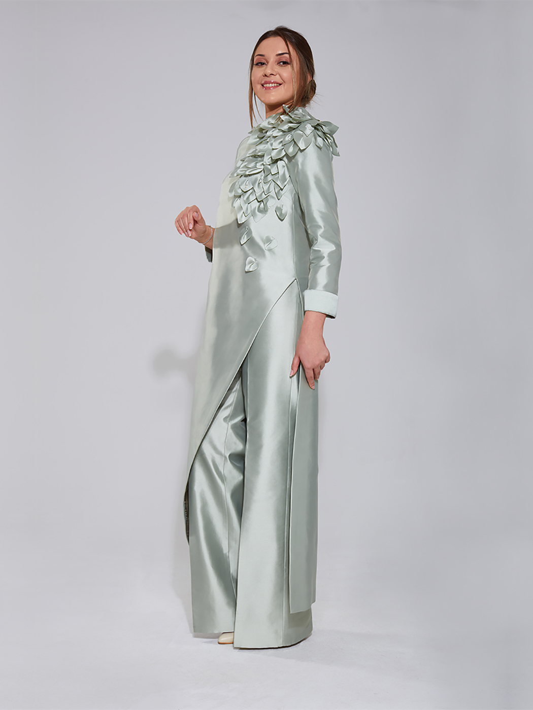 Derin yırtmaçlı, yaprak detaylı pantolon takım