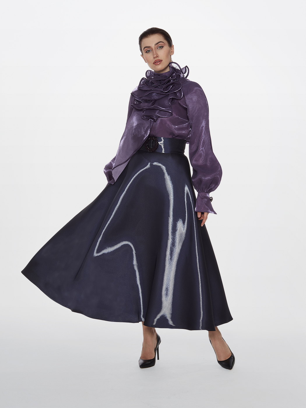Yakası fırfırlı morz bluz ve yarım daire etek.