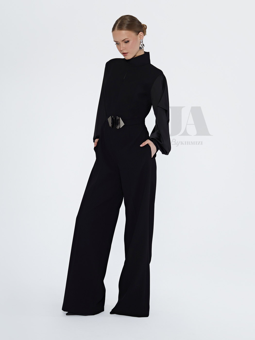 Kolları ipek, kemer detaylı tulum.