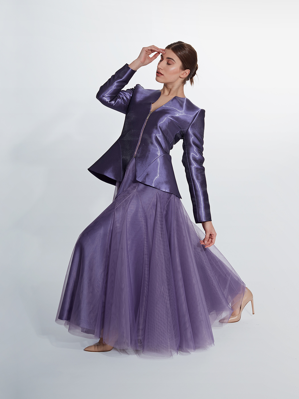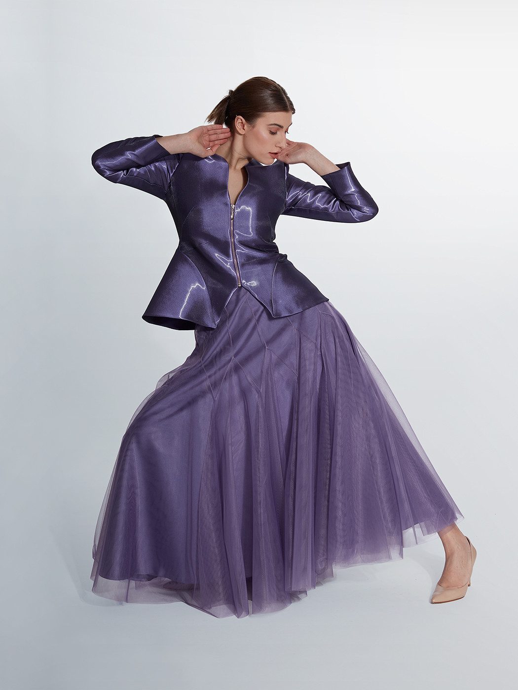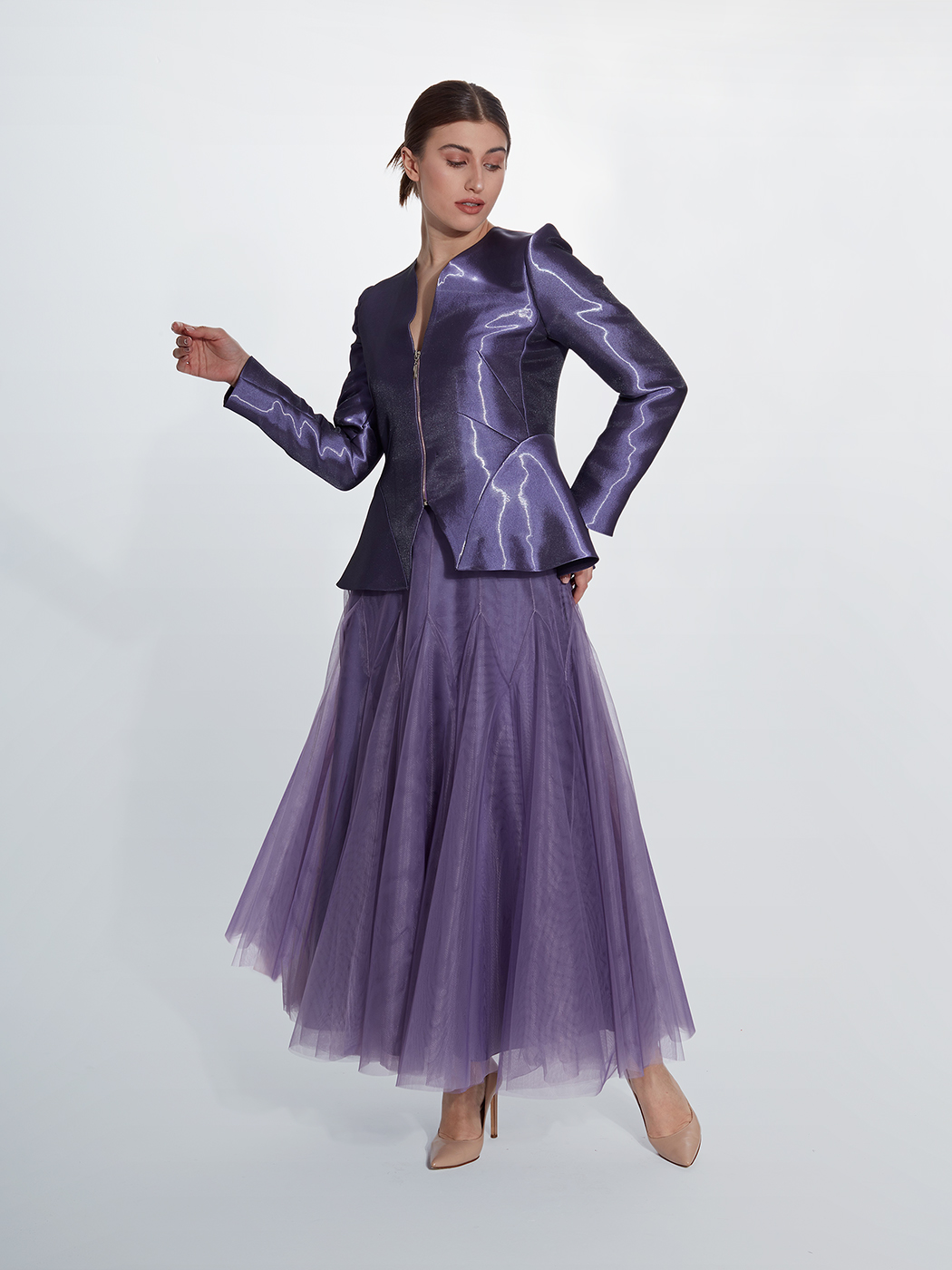 Metal fermuarlı ceket ve çok parçalı tül etek